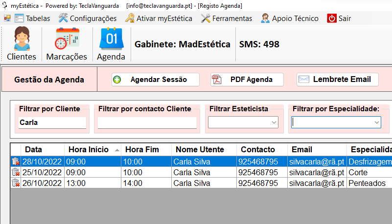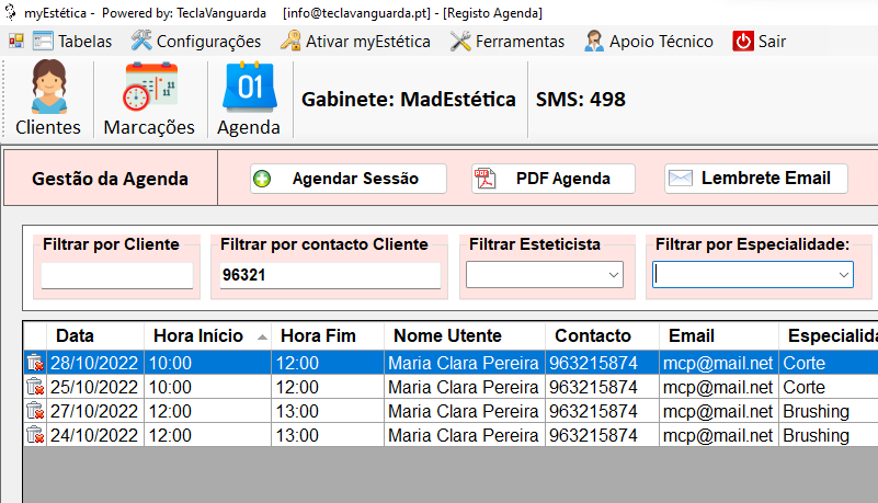 Com uma filtragem avançada pode encontrar uma sessão ou cliente num piscar de olhos. Filtre por Cliente, Contacto, Esteticista, Especialidade e Data.
