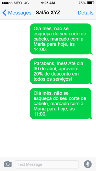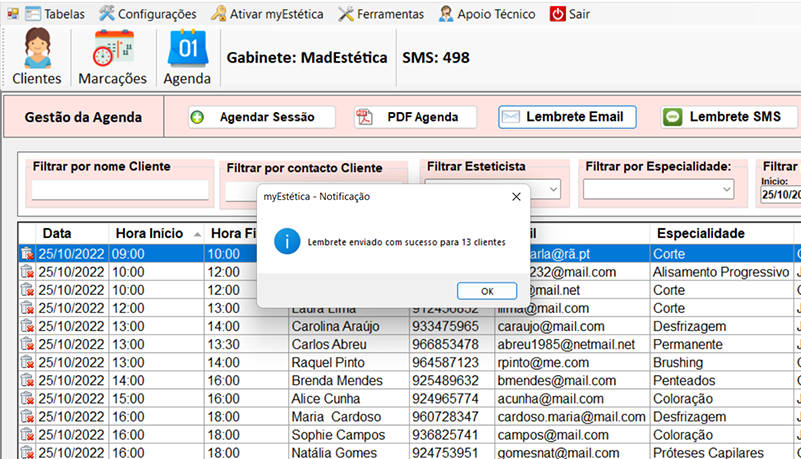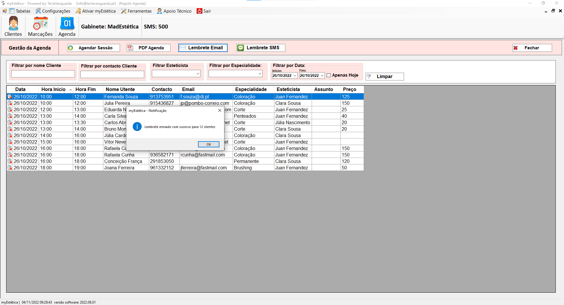Reduza o número de ausências enviando notificações por email ou SMS a relembrar agendamentos. Notifique os seus clientes sobre alterações, promoções ou até mesmo mensagens personalizadas de aniversário. Usufrua de 500 SMS gratuitas na compra do software myEstética.