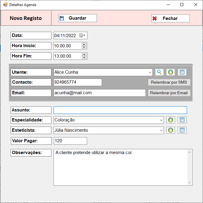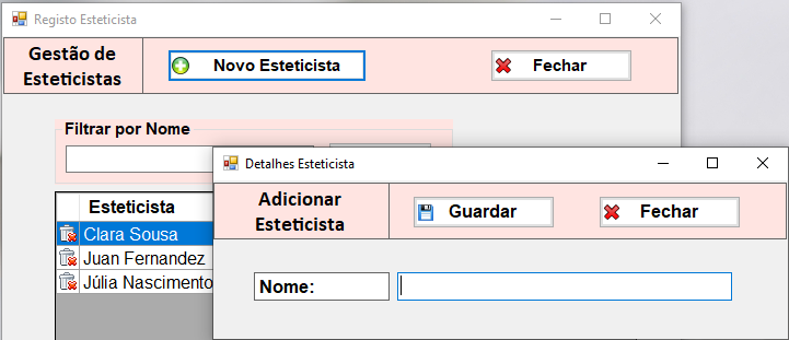 Para adicionar um novo esteticista clique em Novo Esteticista, introduza o nome e guarde.