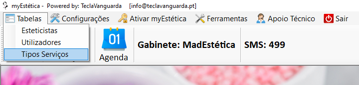 Na barra de menu clique em Tabelas e depois em Tipos de Serviços.