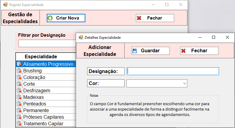 Para adicionar um novo serviço clique em Criar Novo, introduza o nome do serviço, e.g. "Corte", e selecione a cor para associar a este serviço.