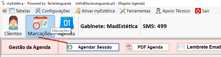 Na barra de menu clique em Marcações e depois em Agendar Sessão.