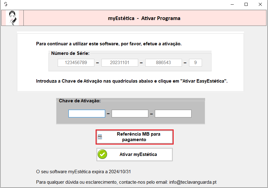 Caso a ativação automática falhe ou precise de reinstalar o software basta introduzir a chave de ativação e clicar em Ativar myEstética.