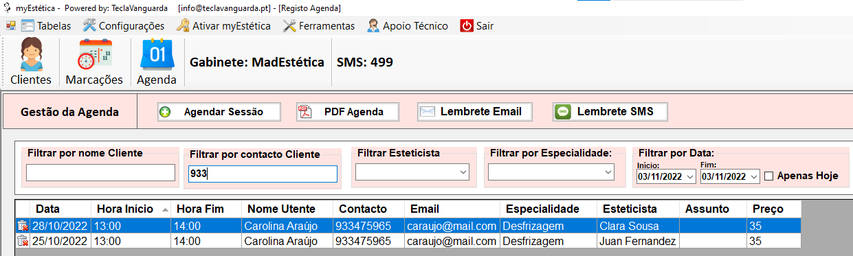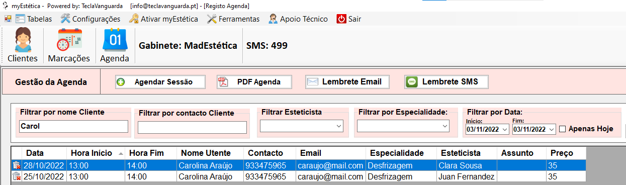 Para lembretes individuais filtre o cliente por nome ou contacto.
