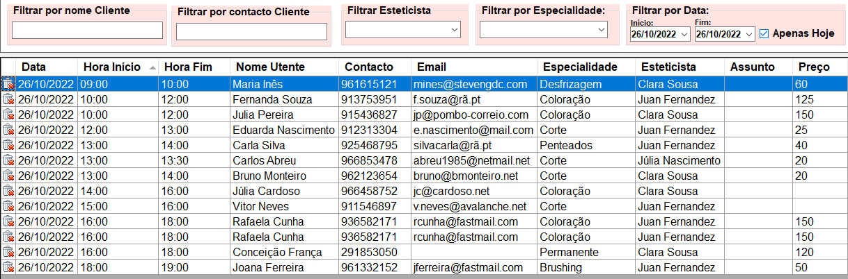 Envie um lembrete por email ou sms para todos os agendamentos de hoje, ou um sms individual para aquele cliente mais esquecido. Em Marcações pode filtrar por data, ou selecionar Apenas Hoje para enviar lembretes a todos os clientes no intervalo selecionado.